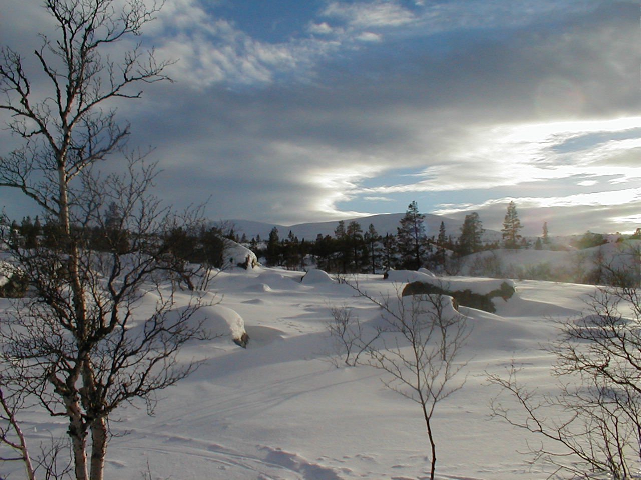 Emner: Natur og vitenskap, Naturfag Stikkord: Snø, Fjelltopp, Fjell, Bjørk, Bjørkeskog, Vinter, Skuterspor