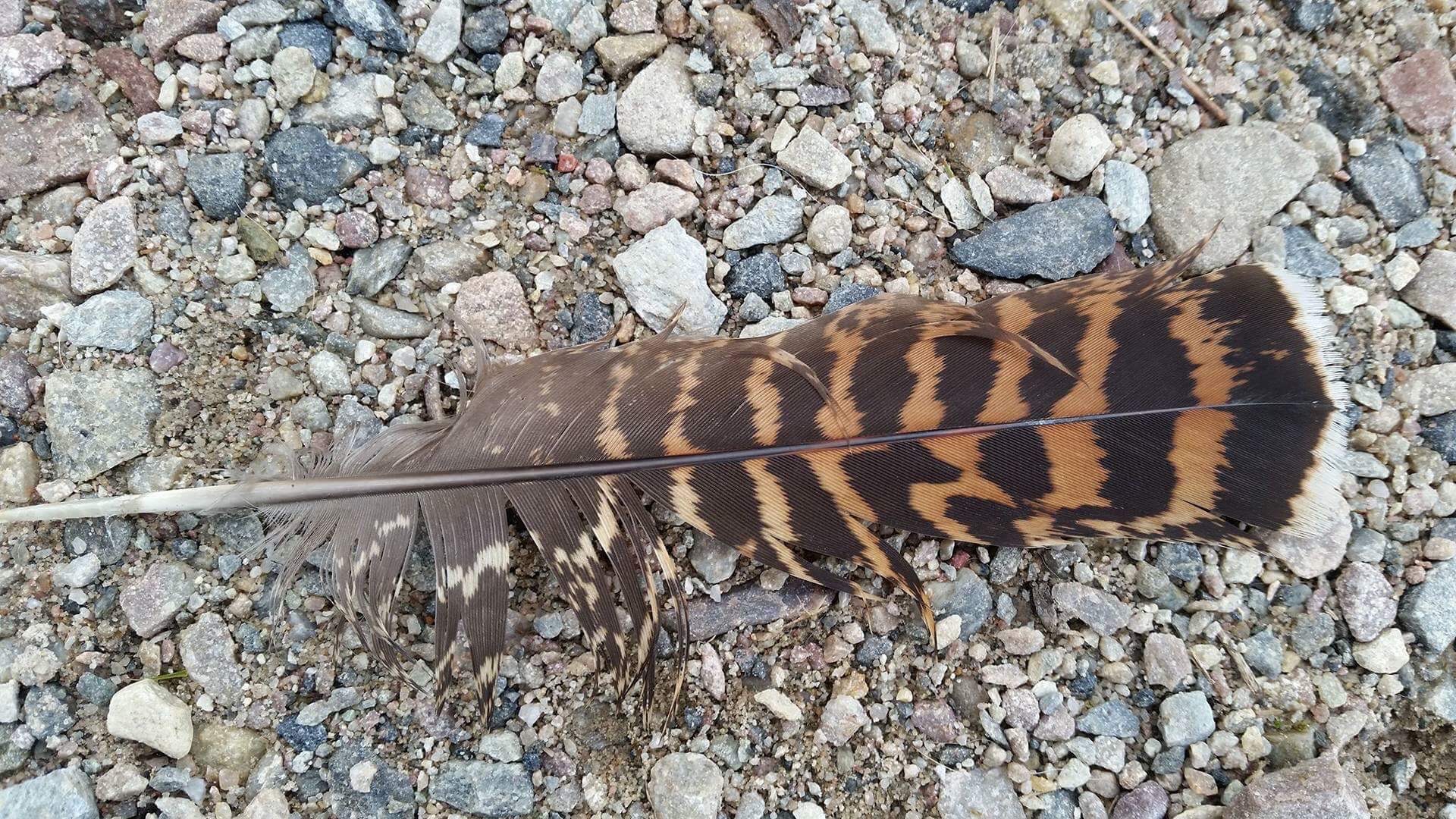 En fjær ligger på bakken.
